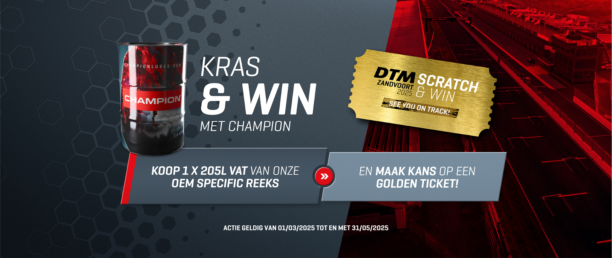 Bestel een vat van 205L van CHAMPION OEM SPECIFIC en maak kans op een gouden ticket. Voer de unieke code in die op uw gouden ticket staat om te ontdekken of u tickets hebt gewonnen voor de DTM-race in Zandvoort!