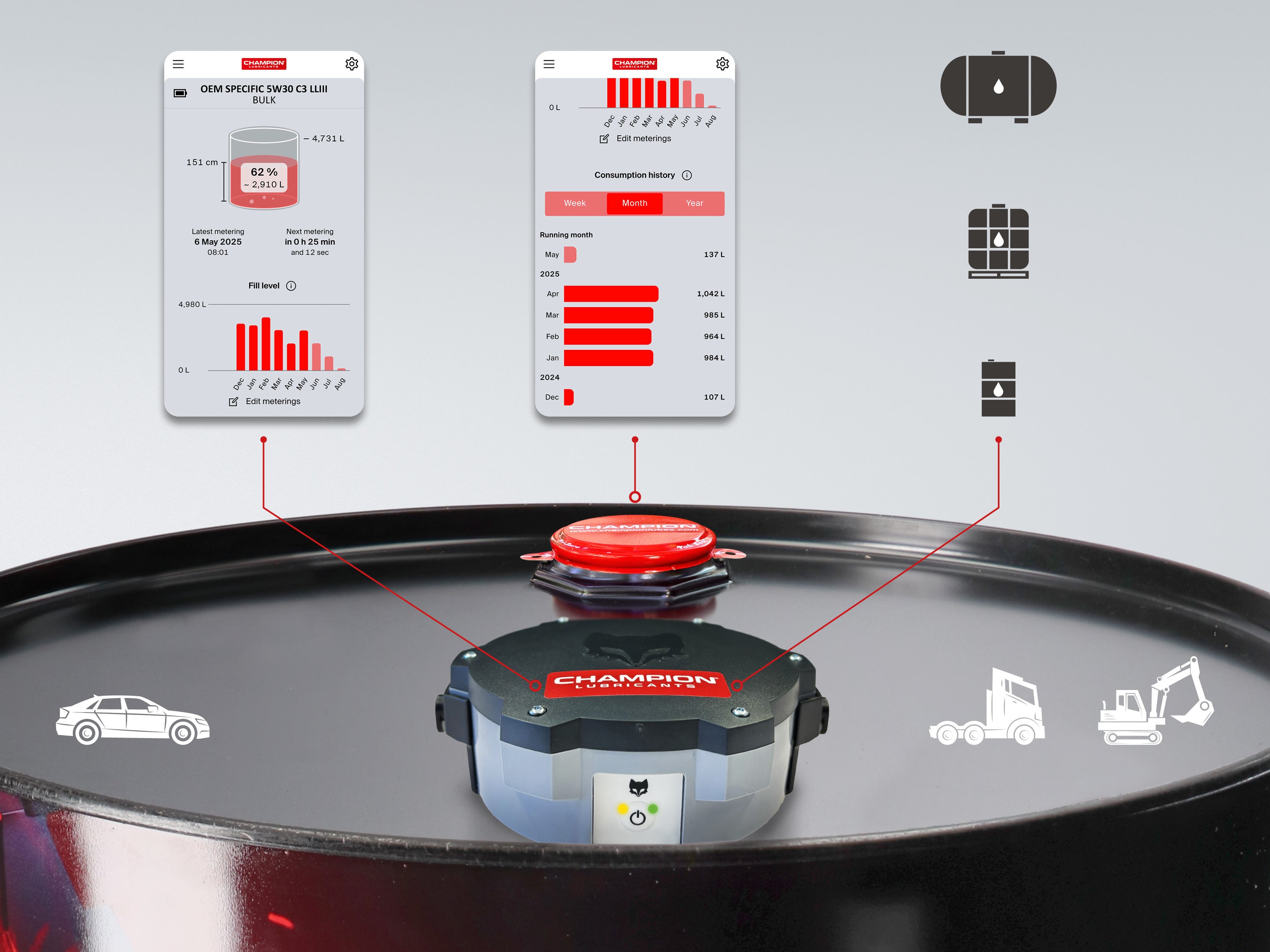 • meet het actuele vulniveau per drum, IBC of tank, per smeermiddel